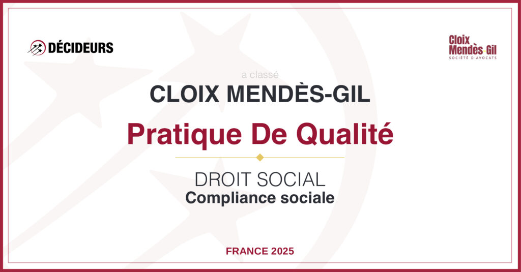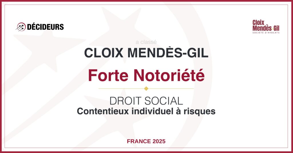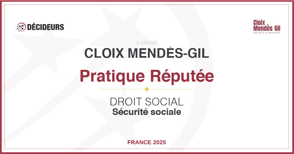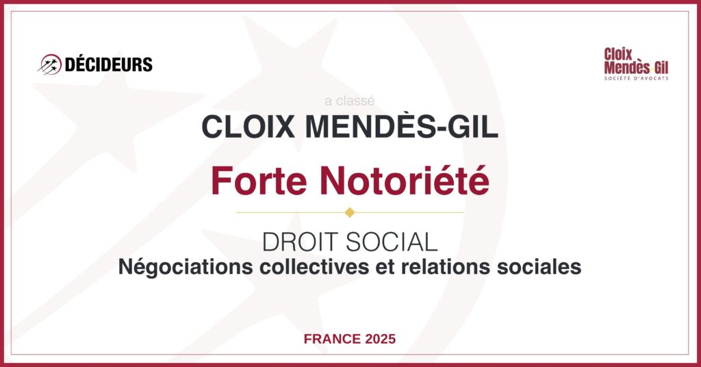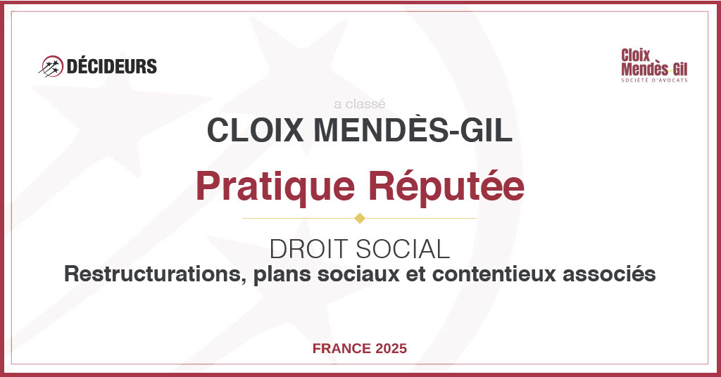 Nous sommes fiers d’annoncer que Cloix Mendès-Gil figure dans l’édition 2025 du guide Relations Sociales & Droit du Travail publié par Décideurs Juridiques, dans cinq catégories de référence :